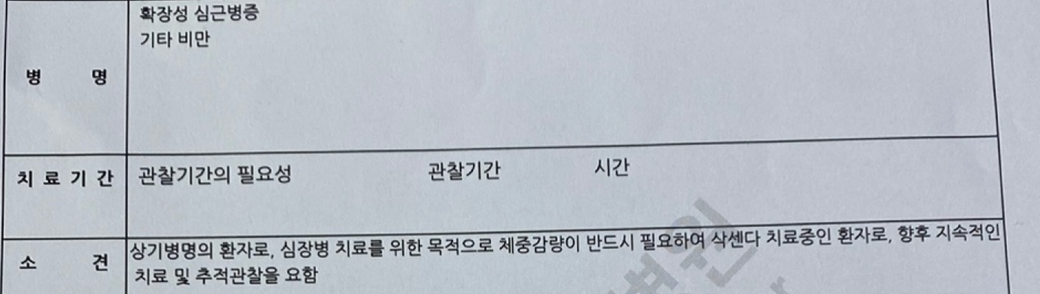 심장치료를 목적으로 체중감량이 반드시 필요하다는 소견서도 발급받은상태이며