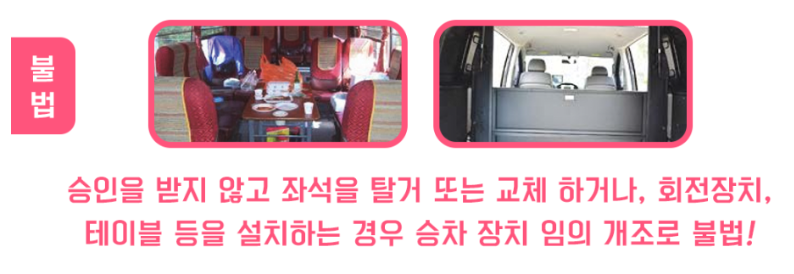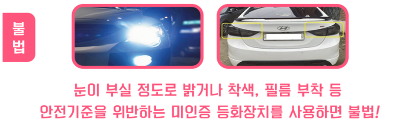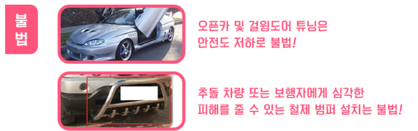 한국교통안전공단에 올라온 예시입니다. 오픈카 및 걸윙도어 튜닝, 심각한 피해를 줄 수 있는 철제 범퍼, 승인을 받지 않고 좌석 탈거 및 교체, 눈이 부실 정도로 밝거나 착색, 필름 부착 등은 불법 튜닝입니다.