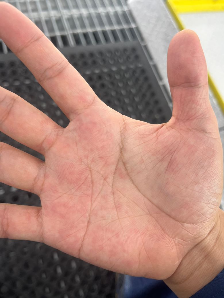 피부가 많이는 아닌데 간지럽고 제가 일때문에 잠을 평소보다 못 잤고 공장에서 장갑 끼고 일하는데