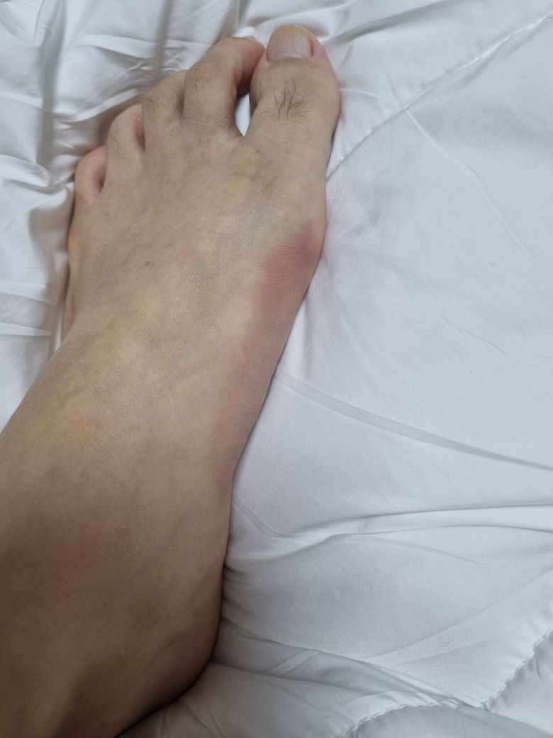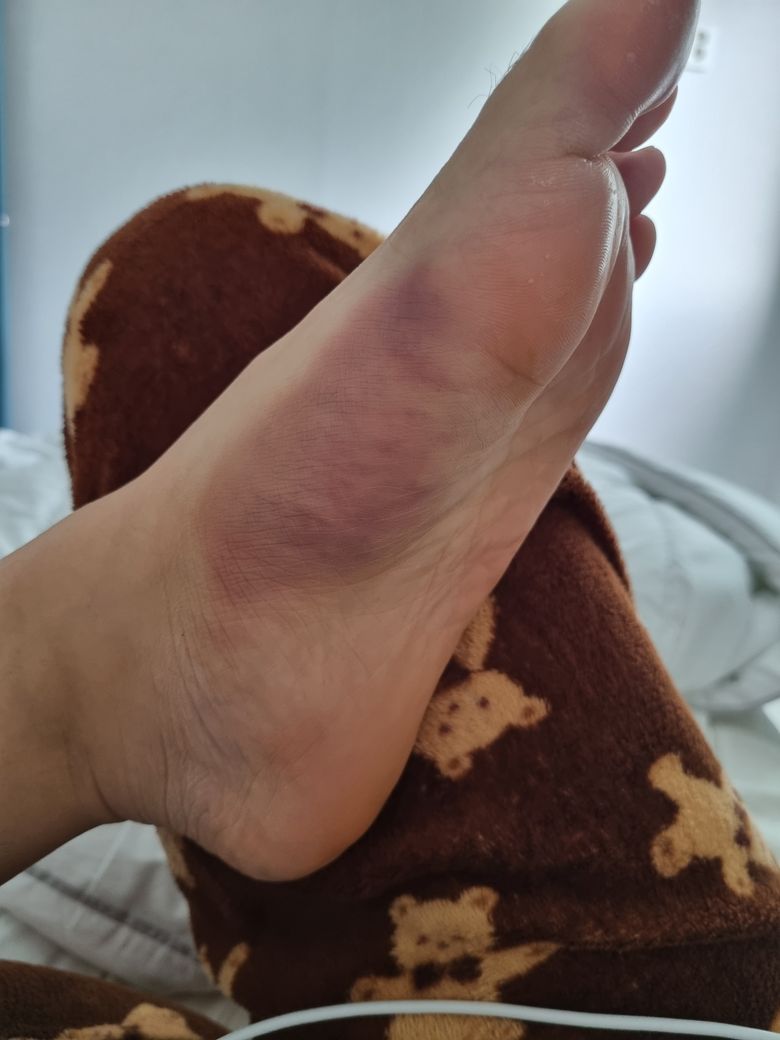 어제 의자위에 서있다가 의자가 넘어지면수 의자다리를 밟은거같아요. 어제는 혹처럼 조금 부은거같더니 자고일어나니 멍들어 있어요.