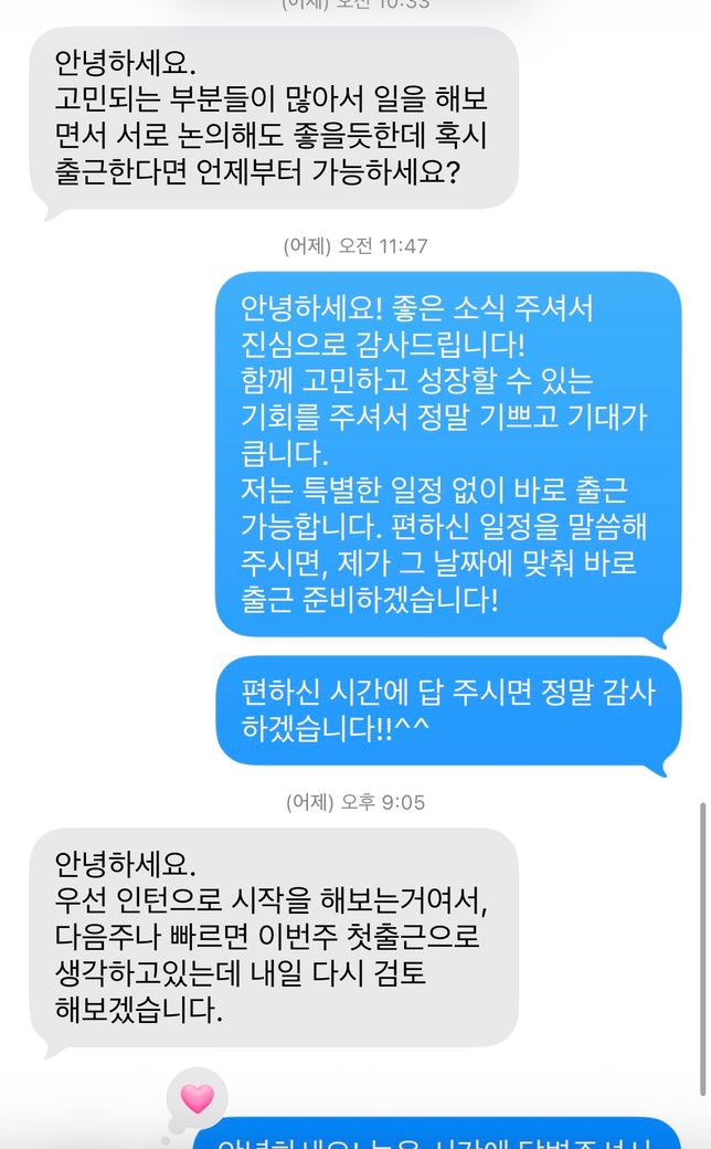 안녕하세요 전 올해 졸업하고 취업을 준비하던 취준생입니다. 취업 준비하던 중 제가 가고싶었던 회사가 있었는데 마침 교수님께서 이력서랑 자소서 포폴 전부 다 보내주면 회사로 전달해주시겠다 하셔서 보내드렸더니 회사에서 바로 다음날에 면접 보러 오라고 문자를 주시더라구요. 그래서 몇일 뒤에 날 잡아서 면접을 보기로 했고 월요일에 면접을 보고 왔는데요 월요일에 면접보고 바로 다음날인 화요일 오전에 저렇게 먼저 문자가 오신거에요.!! 그래서 너무 꿈만 같았고 정말 이게 합격이 맞나 싶을 정도로 눈물이 나더라구요..! 문자보면 멘트도 그렇고 어느정도 제가 괜찮긴 했으니 합격시켜주신거겠죠.? 우선 인턴으로 시작하는 거라, 이 멘트도 좋은 걸까요.? 저는 교수님이 서류를 다 전달해주시고 회사에 지원도 다 도와주셨던 케이스인지라 사람인 잡코리아를 들어가봤거든요 근데, 사람인에는 가보면 거긴 정규직 (수습3개월로) 써져있더라구요 그리고 잡코리아에는 인턴 3개월 후 정직원 계약 되어있고 잡코리아 밑에는 또 정규직 수습 3개월로 써져있더라구요 잡코리아는 둘다 써져있더라구요, 그래서 정규직 수습 3개월이나 인턴 3개월이나 둘다 같은 개념이죠.? 제가 아직 부족한게 많은 신입인지라 일 좀만 못하면 어떻게 합격한건데 들어가자마자 얼마 안되서 정직원 못될까 걱정이네요ㅠ 일단 저 최종합격 맞는 거죠.???