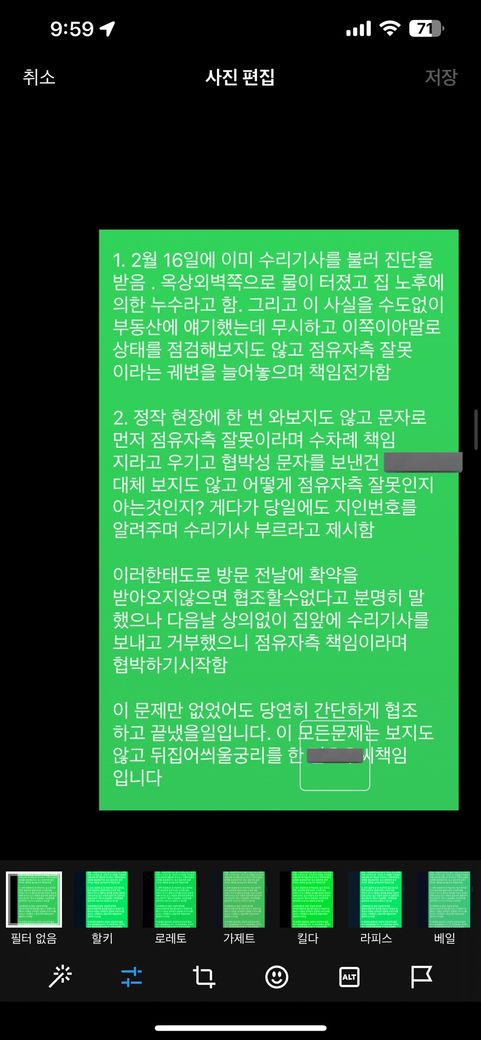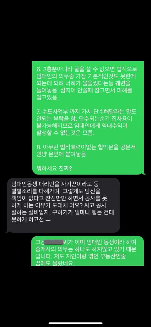 2월달에 옥상이랑(저희집이 옥상층) 아래층 누수가 발생해서 저희 사비로 급하게 고쳤는데 수리기사님한테 건물구조랑 노후때문이라고 진단받아서 집주인한테 3층 피해입은거 고쳐달라고했는데 두달동안 집와서 확인도 안해보고 저희책임이라고 뒤집어씌운 사건입니다.