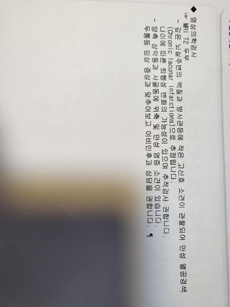 검진센터에서 3분만에 뇌MRI찍었는데 결과가 아래와 같습니다. 상황이 심각한지 앞으로 건강관리를 어떻게해야할지 등 알고싶습니다. 더 추가적인검사는 뭘해야하나요?