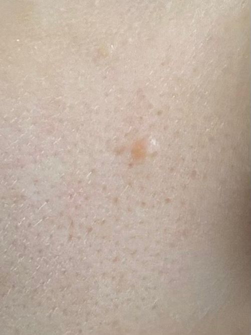사진상 병변은 직경 수 mm 정도의 살색–연한 갈색의 구진으로 보이며, 표면이 비교적 매끈하고 중심 함몰이나 각질 마개는 뚜렷하지 않습니다. 반복해서 압출 시 피만 나왔다면 전형적인 면포성 여드름 가능성은 낮습니다.