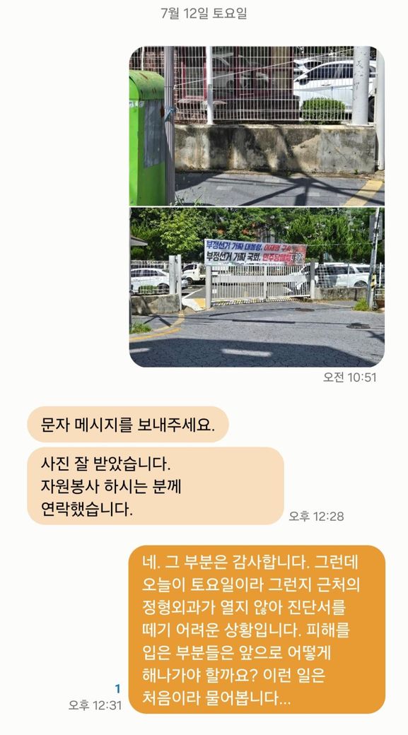 해당 정당은 철거하겠다는 말 외에는 전혀 연락이 없습니다. 첫 통화 이후에 피해를 입은 부분에 대해서 이야기를 나누려고 전화를 했는데 전화는 피하고, 문자 메시지를 달라해서 문자를 보냈는데 읽지는 않습니다.