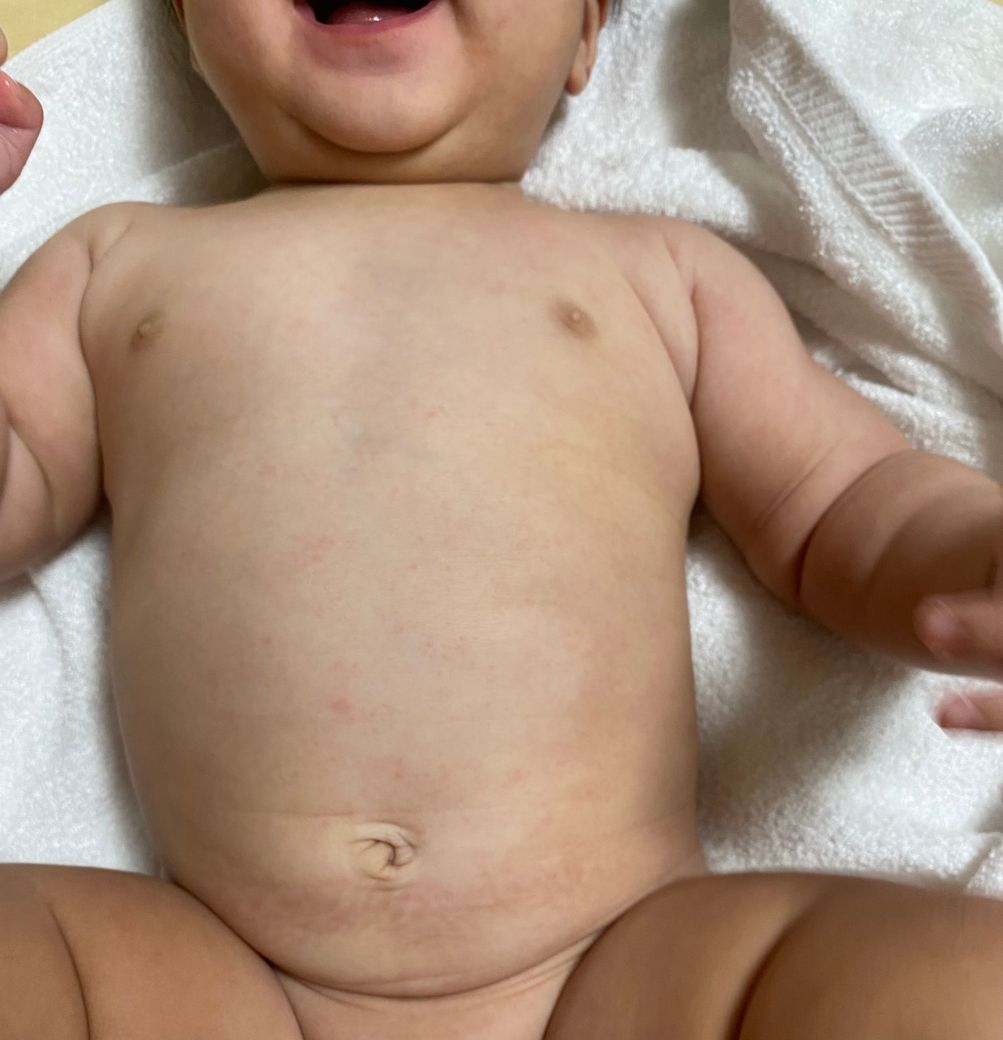 이유식 중인 아기 배에 붉은 반점 알레르기일까요?