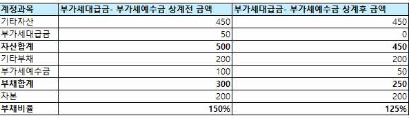 부가세예수금이 부가세대급금과 상계하게 되면 아래와같이 부채비율은 줄어들게됩니다.