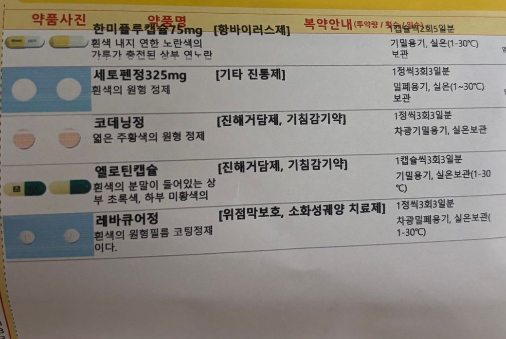 약품명 : 1. 한미플루캡슐 75mg 2. 세토펜정 325mg 3. 코데닝정 4. 엘로틴캡슐 5. 레바큐어정