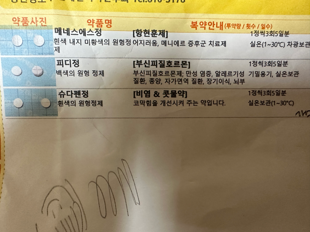 메니에르병에 대한 치료약을 드시고 있으며 이에 대한 추정진단을 받으신 것 같습니다.