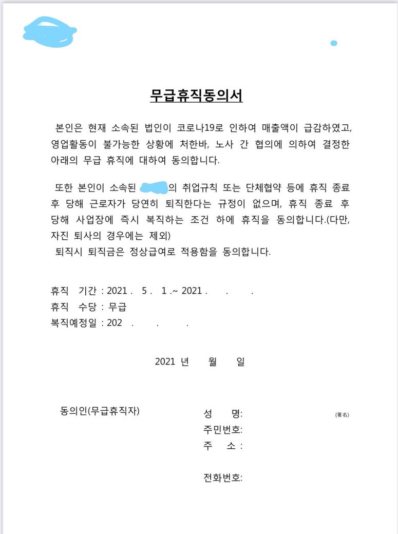 질문하신 내용에 대하여 아래와 같이 답변 드립니다.무급휴직동의서의 동의시 자유로운의사에 기해서 작성되어야 합니다. 위와같이 작성이 종용하는 것은 자유로운의사에 기한 동의 로 볼수 없을 것입니다.