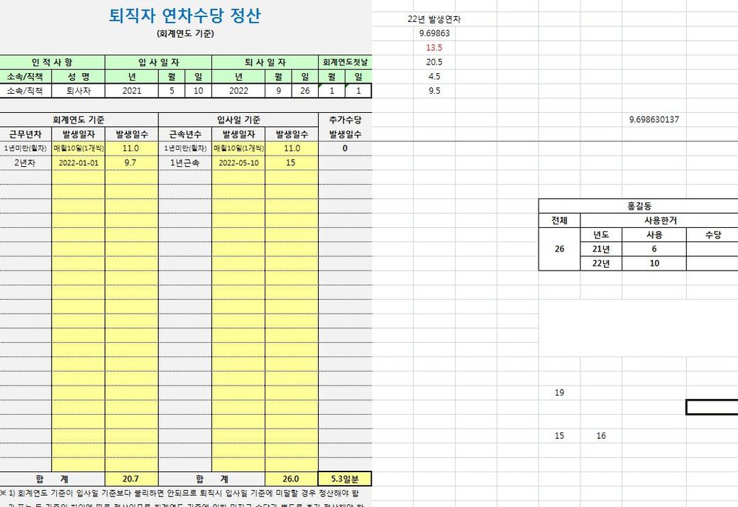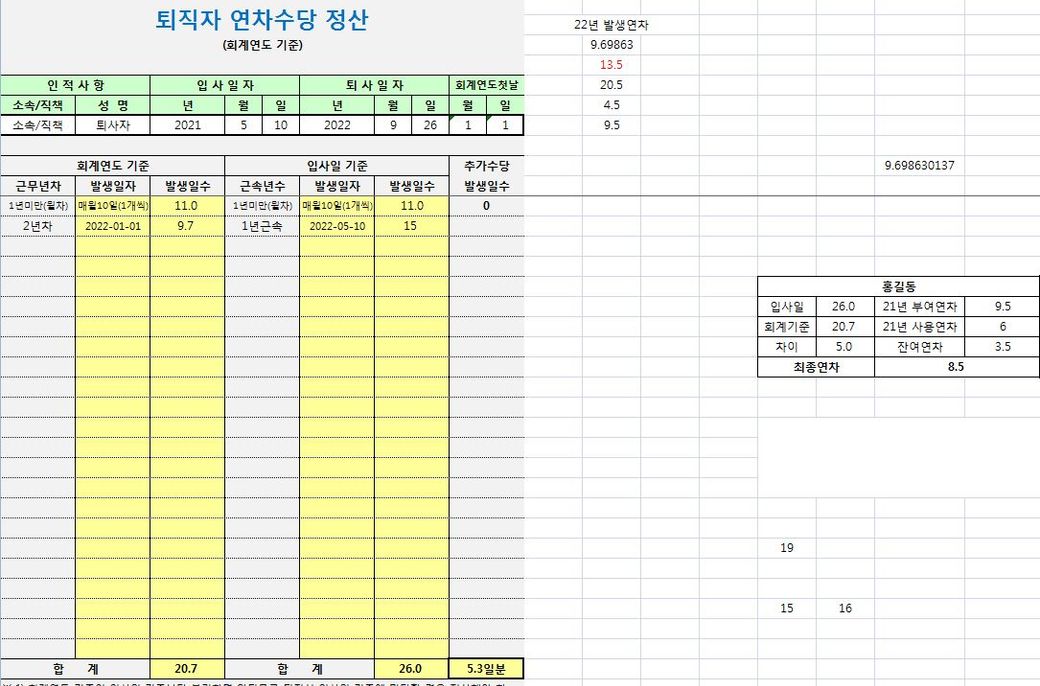 입사일 기준 발생 연차 - 회계연도 기준 발생 연차 = 26 - 20.7 = 5 (차이분)