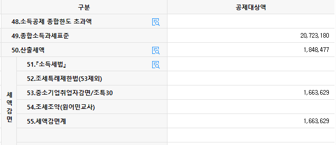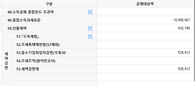 근로자 1은 <53.중소기업취업자감면 금액 = 50.산출세액 * 90%> 로 나오는데,