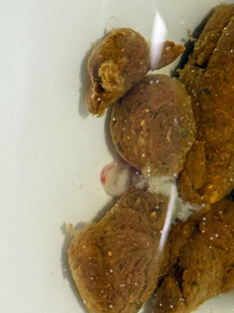 흰색 덩어리는 항문샘에서 분비하는 점액의 가능성이 있습니다.