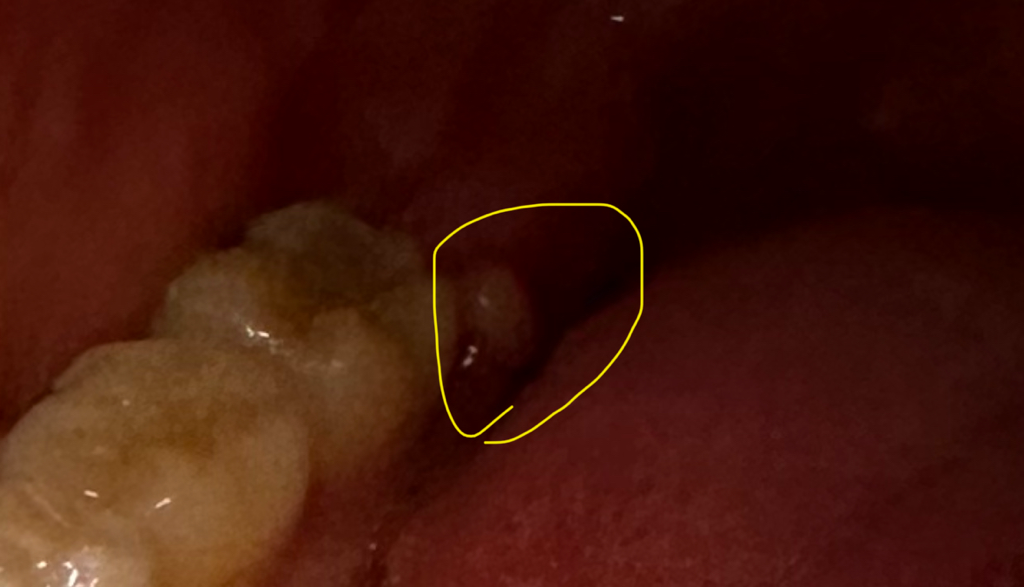 사랑니 뽑은 부위 가장자리 잇몸에 덜 아문 것으로 보입니다. 희게 보이는 것은 딱지 앉은 것으로 보이며 시간이 지나면 점점 없어집니다.