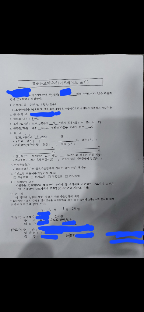 기다린 25일이 되어 매일 월급을 달라고 요청하고 있는데도 불구하고 계속해서 기다려보라고만 하고 지급 받지 못 했습니다. 주휴수당도 시급 11000원에 다 포함된거니 따로 주지 않겠다고 하셨는데..(서면에는 작성되어 있지 않으며 말로만 말하셨습니다.)
