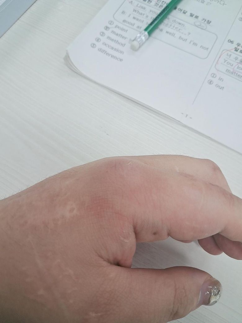 사진처럼 손등쪽에 볼록하게 튀어나왔는데....이건 빨리 사라지는 방법 있을까요?? 만져주면 아프긴한데...마사지 해주면 빨리 가라앉을까요?? 알려주세요ㅠㅠ