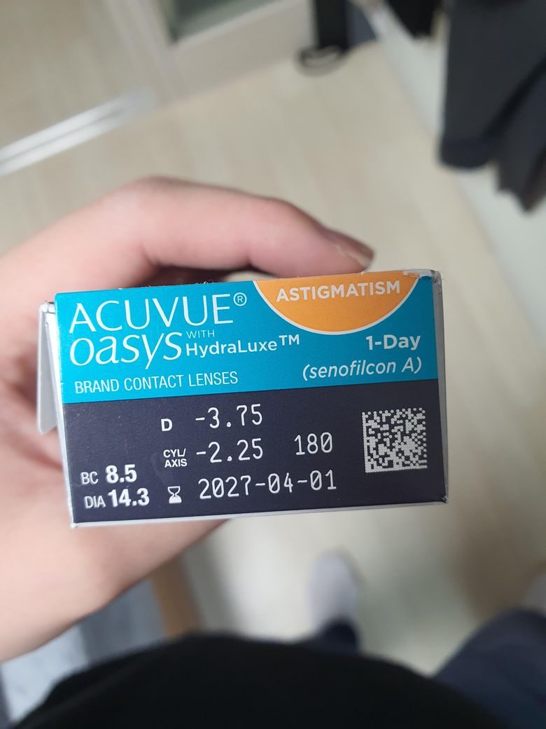 사진 속 소프트렌즈(ACUVUE OASYS 1-Day, -3.75, CYL -2.25, AXIS 180도)는 난시 교정용으로 설계된 제품입니다.하드렌즈에 난시 교정 정보가 없다면, -2.25의 난시가 완전히 교정되지 않을 가능성이 높습니다