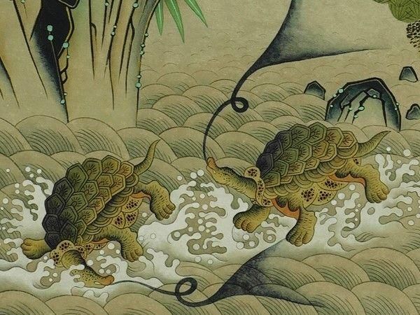 십장생에 나온 거북은 오래 사는 동물을 상징하는 의도로 그려져 나왔어요.