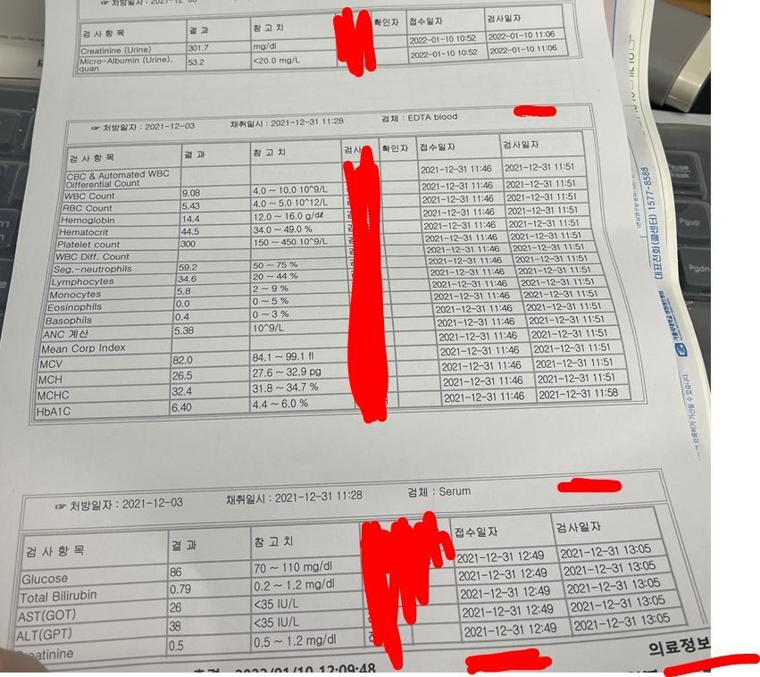 소변 알부민 수치가 높으며 당화혈색소 수치도 높은편에 해당합니다.
