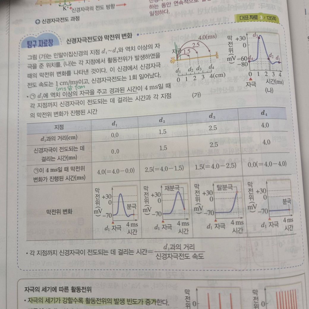 저 부분이 전체적으로 이해가 안 됩니다ㅜㅜ 신경작극이 전도되는 데 걸리는 시간, 막전위 변화가 진행된 시간 이라는 말이 무슨 말인지 모르겠고, 저 수치가 왜 저렇게 되는지도 모르겠어요... 가, 나 그래프도 왜 저렇게 그려지는지 설명해주세요...