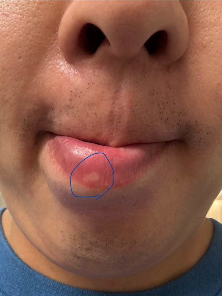 사진상 병변은 하순 점막 쪽에 단일로 보이는 둥근 백색 병변과 주변 홍반이 동반된 형태로, 전형적인 입술 헤르페스보다는 외상성 궤양이나 아프타성 궤양 양상에 더 가깝습니다. 단순포진은 보통 입술 바깥 경계 부위에 여러 개의 작은 물집이 군집 형태로 나타나고, 따끔거림이나 화끈거림 이후 수포가 터지며 딱지가 생기는 경과를 보이는데 현재는 그런 수포 단계가 관찰되지 않습니다.