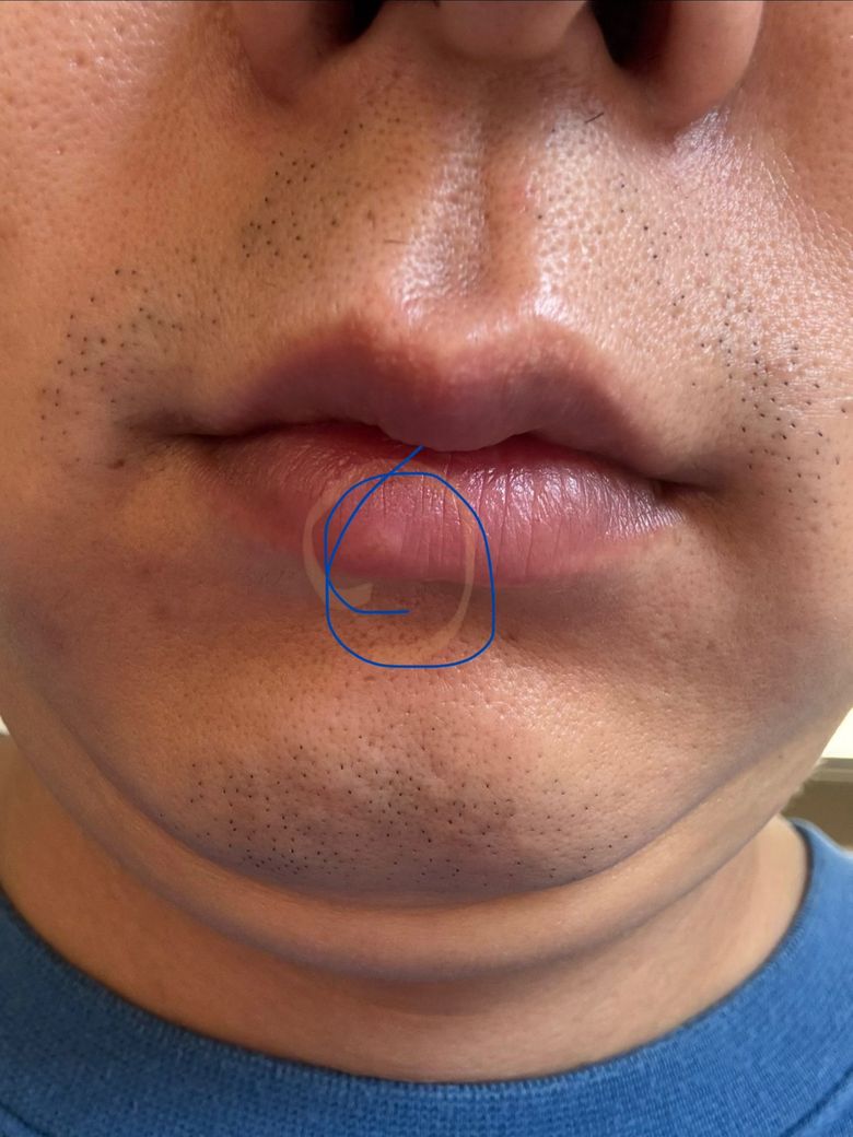 면도 후 손으로 만지거나 입술을 자극한 병력이 있어 미세 외상 이후 발생한 궤양 가능성이 높으며, 아프타성 궤양도 유사하게 중앙이 희고 주변이 붉은 형태로 나타날 수 있습니다. 이러한 병변은 대부분 7일에서 10일 사이 자연 호전되는 경과를 보입니다.