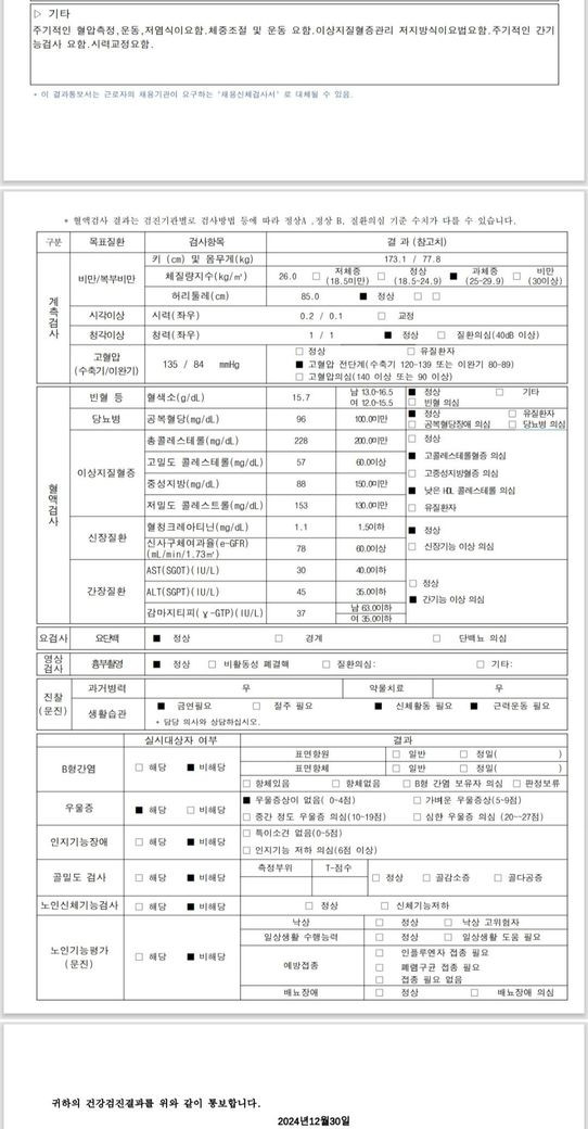 악성질환, 소화기질환, 대사성질환 등등 여러가지 질환에 대해서 이상 여부를 확인해보시기 바랍니다.