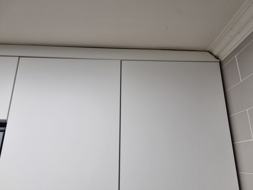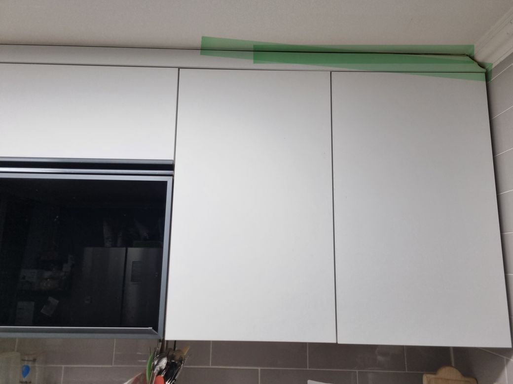 주방 수납장 윗부분에 접착부분이 떨어지고 있어요.