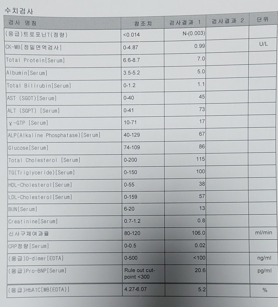 심장피검사에서는 트로포닌, bnp, ck mb, ldh, crp 다 정상으로 나왔습니다