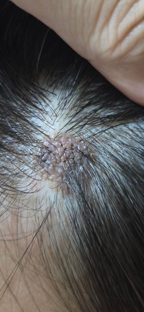 사진에서 보이는 두피의 병변은 표피낭종 혹은 지루성 각화증일 가능성이 있어 보입니다. 이는 피지나 각질이 피부 아래 쌓여 생기는 양성 종양으로, 작고 단단한 덩어리 형태로 나타나며 통증은 없지만 가려움증이나 염증이 동반될 수 있어요. 사마귀나 진균 간염도 감별 하셔야 할 듯 하구요. 드물지만 종양 가능성도 있습니다.