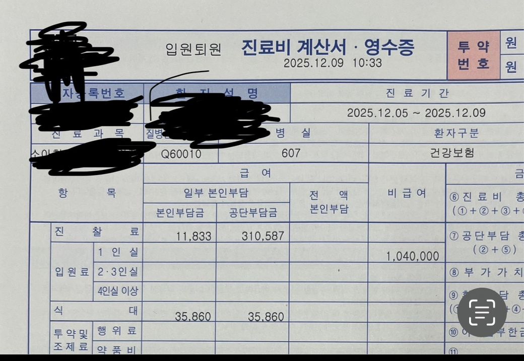 자녀가 5일 종합병원 입원해서 1인실을 이용했습니다