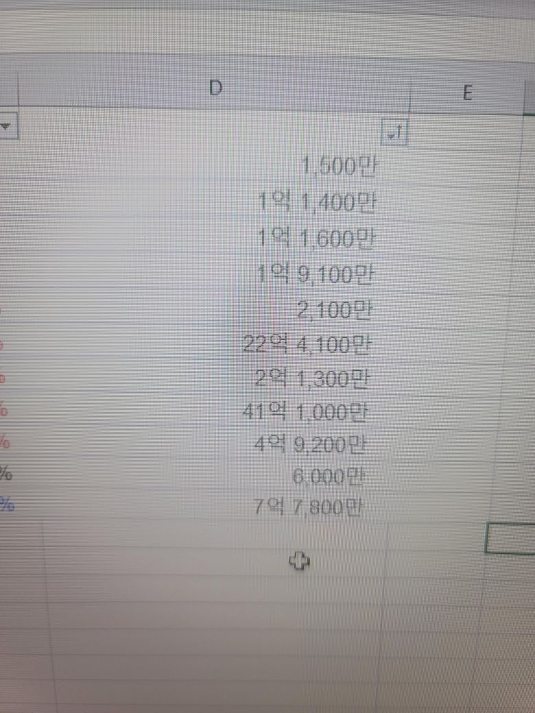 그럼 D탭 제일 상단에 아래쪽 화살표가 생길텐데요. 화살표를 클릭하셔서 오름차순이나 내림차순 정렬을 선택해 주시면 됩니다.