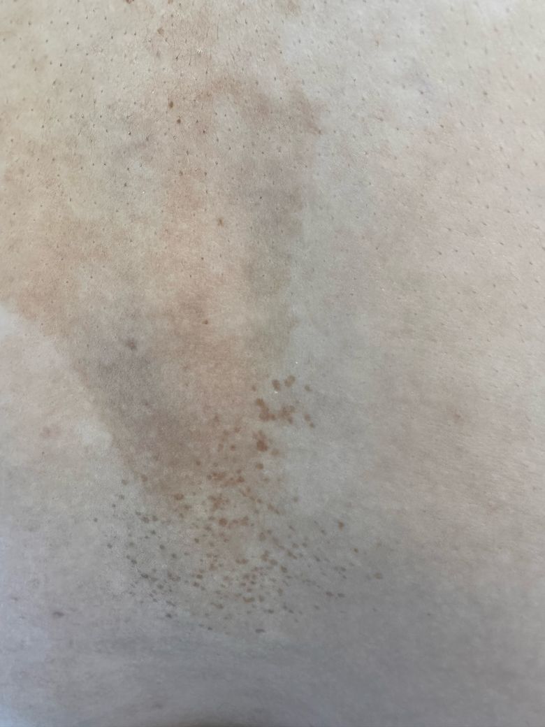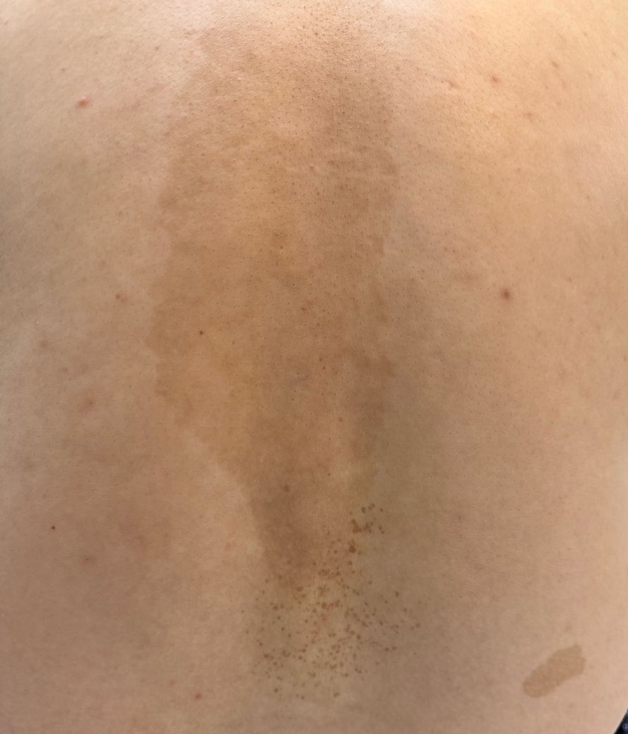 사진상 병변은 등 중앙을 따라 비교적 넓게 퍼진 갈색 색소침착으로 보이며, 일부 작은 점 형태의 색소가 군집한 부분도 관찰됩니다. 다만 사진만으로 정확한 진단은 제한적입니다.