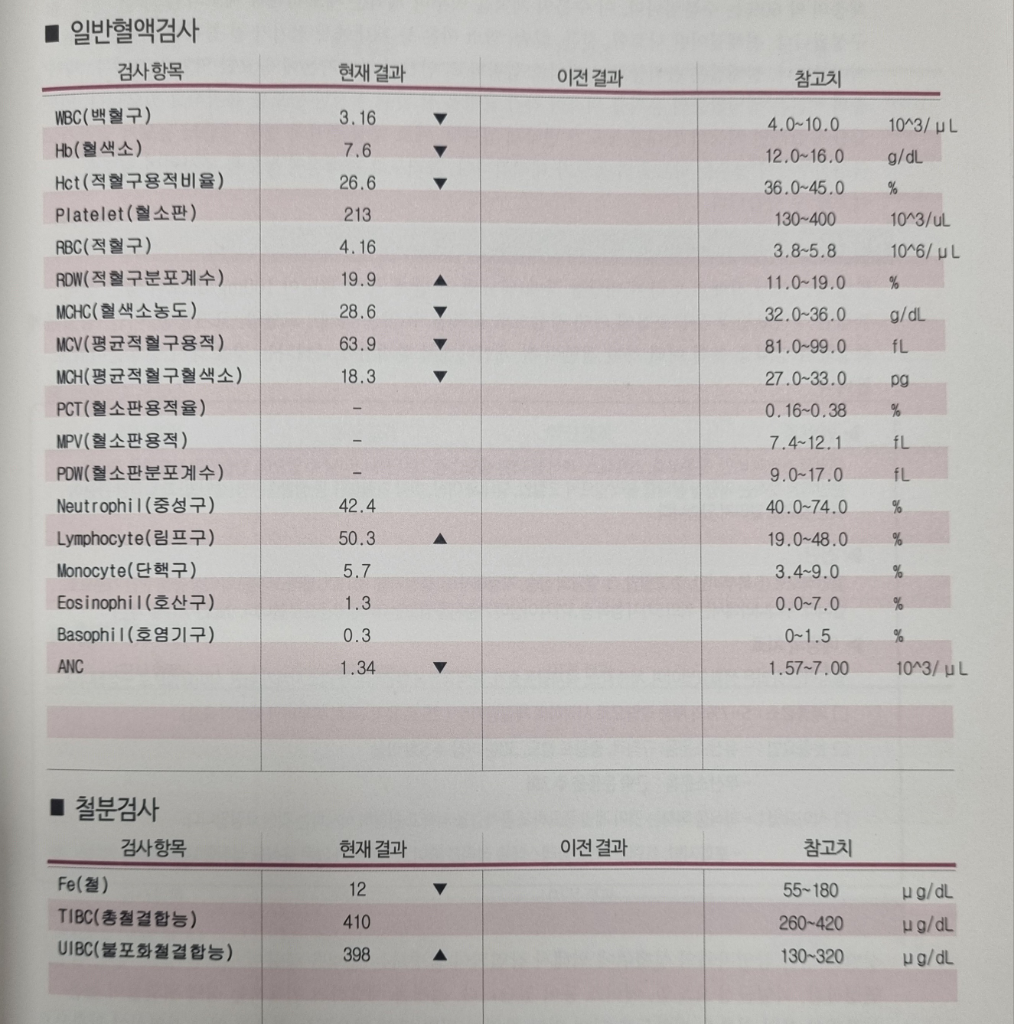 혈액검사결과는 철 결핍성 빈혈을 시사합니다.