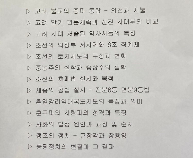 역사에서 서술형하면 대부분 목적, 의의, 특징을 서술하라고 나와요. 인물들 같은 경우에는 '해당 인물의 업적을 몇가지 이상 쓰시오.' 이런식으로요.
