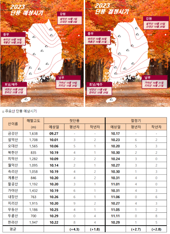 10월이 시작 되었습니다. 10월이 오면 산들이 울긋불긋 단풍으로 옷을 갈아 입는 시기인데요. 지역별 첫단풍 시기와 절정기 알려주세요?