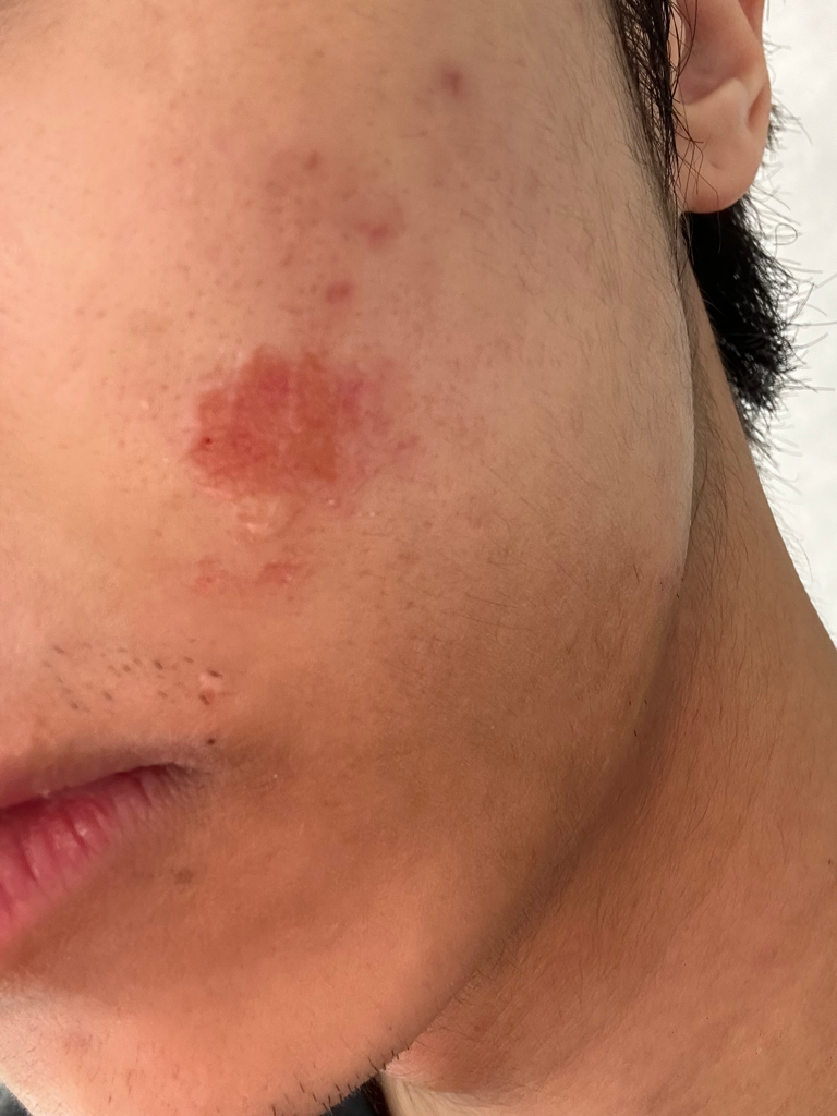 알래르기 반응 같습니다. 염증 생기지 않게 병변을 깨끗이 하시고 따끔거리거나 물집이 잡히면 피부과 내원해 진료 받아 보세요