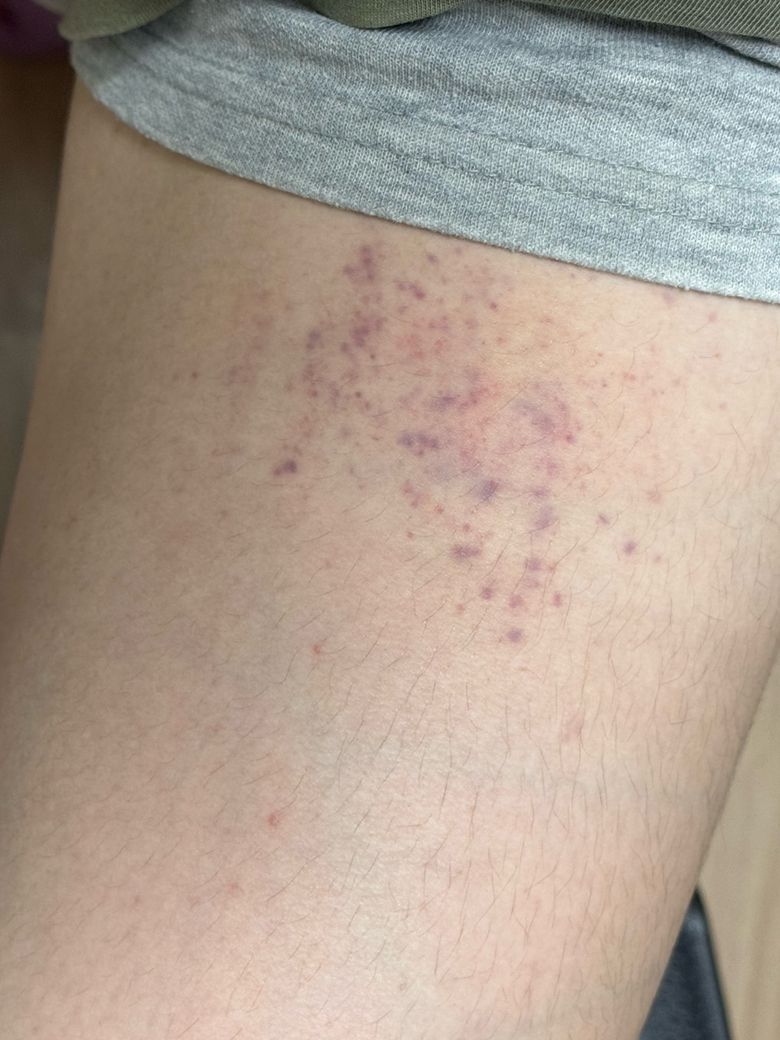 적어주신 내용과 올려주신 사진으로 미루어 가렵다고 긁으면서 생긴 피하 출혈이 원인으로 생각됩니다.