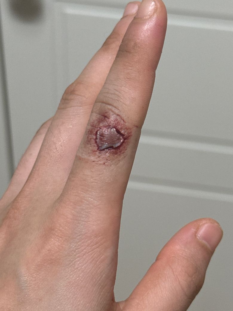 손가락 살점이 많이 떨어져 나가셨네요. 많이 아프고 불편하시겠습니다.
