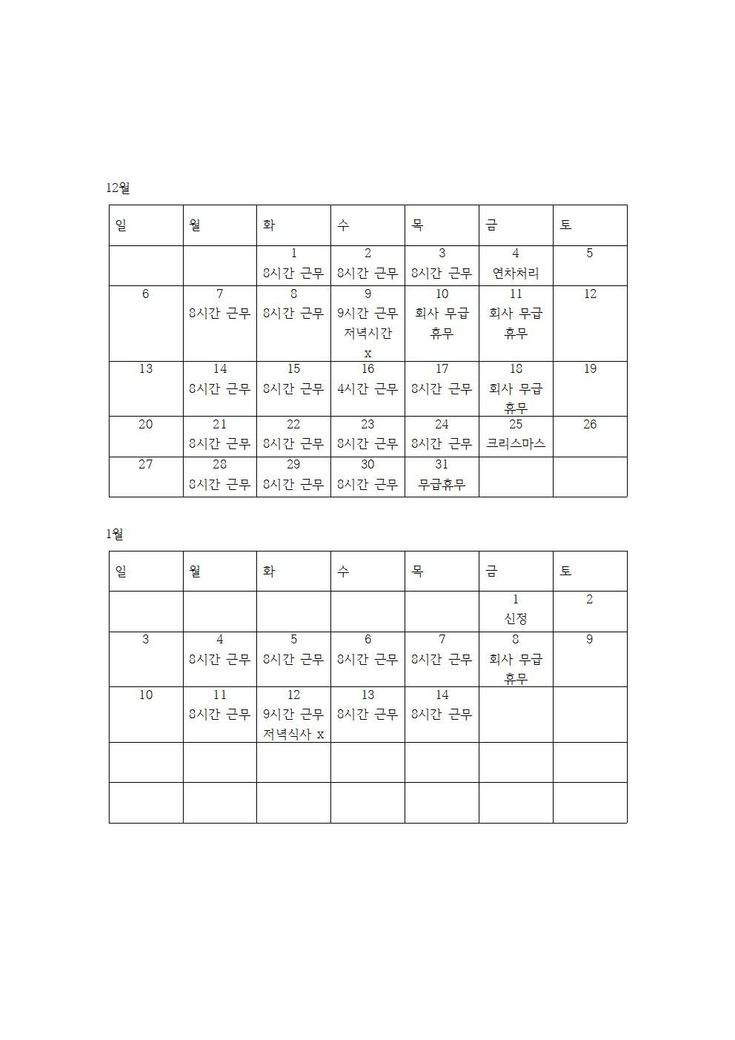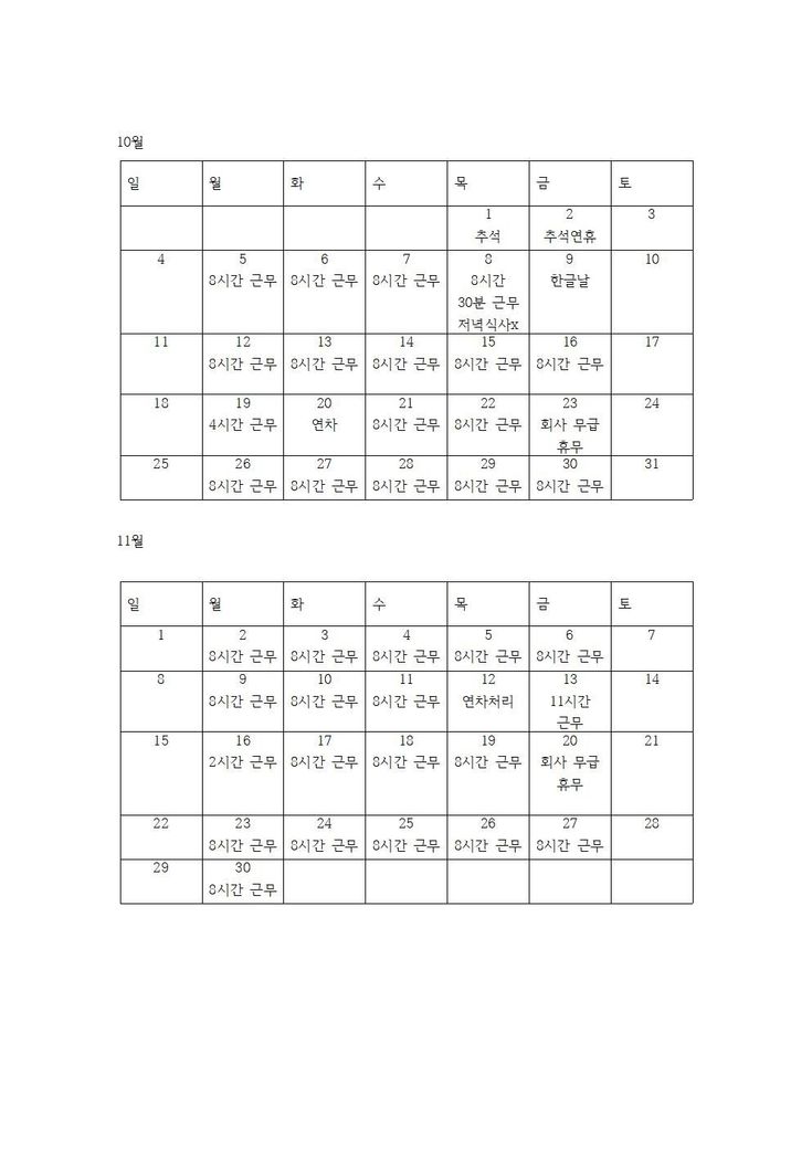 또한 첨부자료에서 저녁식사 x 라고 표시한 부분은 저녁시간 없이 연속근무이며,