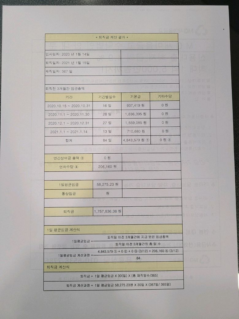 또한 퇴직금에도 퇴사전 3개월평균 임금의 30일치에 소소한 금액이나 1일 근무일 수에 대한 산출액(30일치 임금/356일)도
