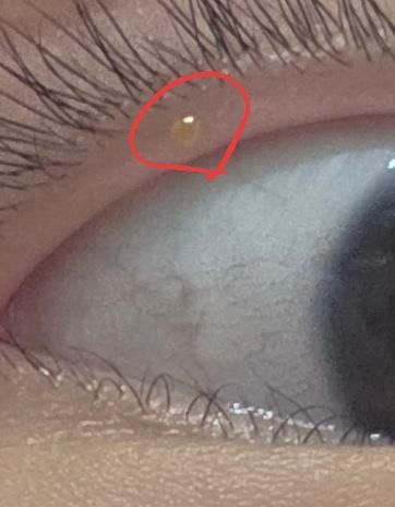 처음사진은 눈꺼풀에 있는 기름샘인 마이봄샘이 막혀서 생긴것입니다. 온찜질과 눈꺼풀 세정을 잘하면 소실될것입니다. 래도 안되면 안과에서 짜내면 좋겠습니다.