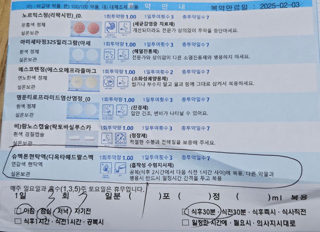 문의주신 사진의 감기약들과 장염약은 함께 복용을 하셔도 괜찮으며, 슈멕톤 현탁액은 다른약들의 흡수를 방해할수 있기에 다른약과는 1시간 이상 시간차를두고 따로 공복에 복용하길 권장드립니다.
