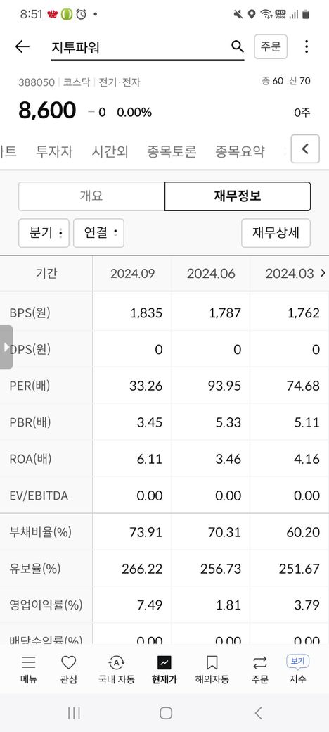 지투파워는 2023년부터 영업이익 측면에서 적자로 전환된 기업입니다. 부채가 늘어나면서 작년 한해에도 영향을 주다보니 부채비율이 높게 나오고 있습니다.
