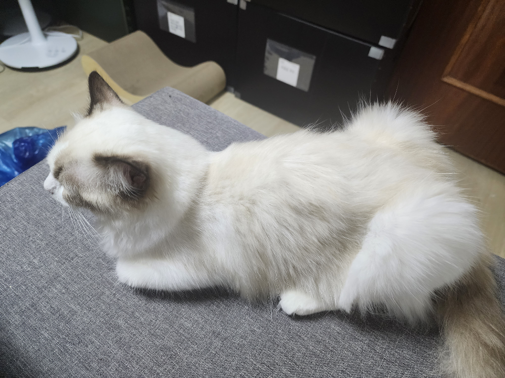 식빵굽는 자세입니다. 고양이가 안정을 취하기 위해 하는 자세라고 볼 수 있습니다. 중성화수술 후 아프기 때문에 안정을 취하기 위함으로 볼 수 잇습니다.