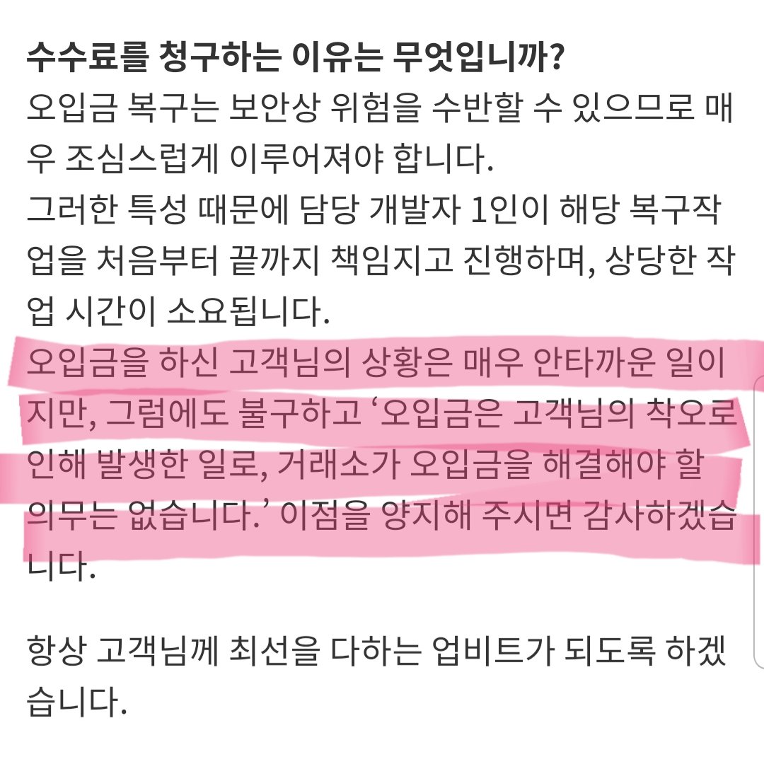 위에보시면 "오입금은 고객님의 착오로 인해 발생한 일로,거래소가 오입금을 해결해야 할 의무는 없습니다". 라고 나와있습니다.