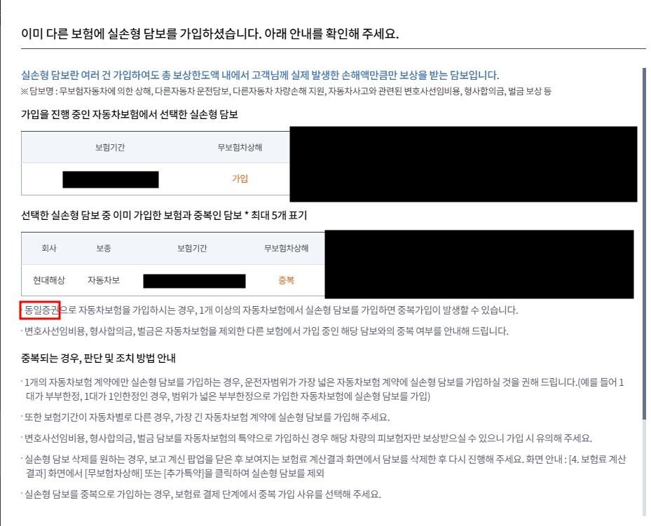 갱신하려고 하는데 무보험차상해 적용하니까 위 1번의 자동차 보험 보장 내 해당항목과 중복이라며 안내문구가 뜨네요.