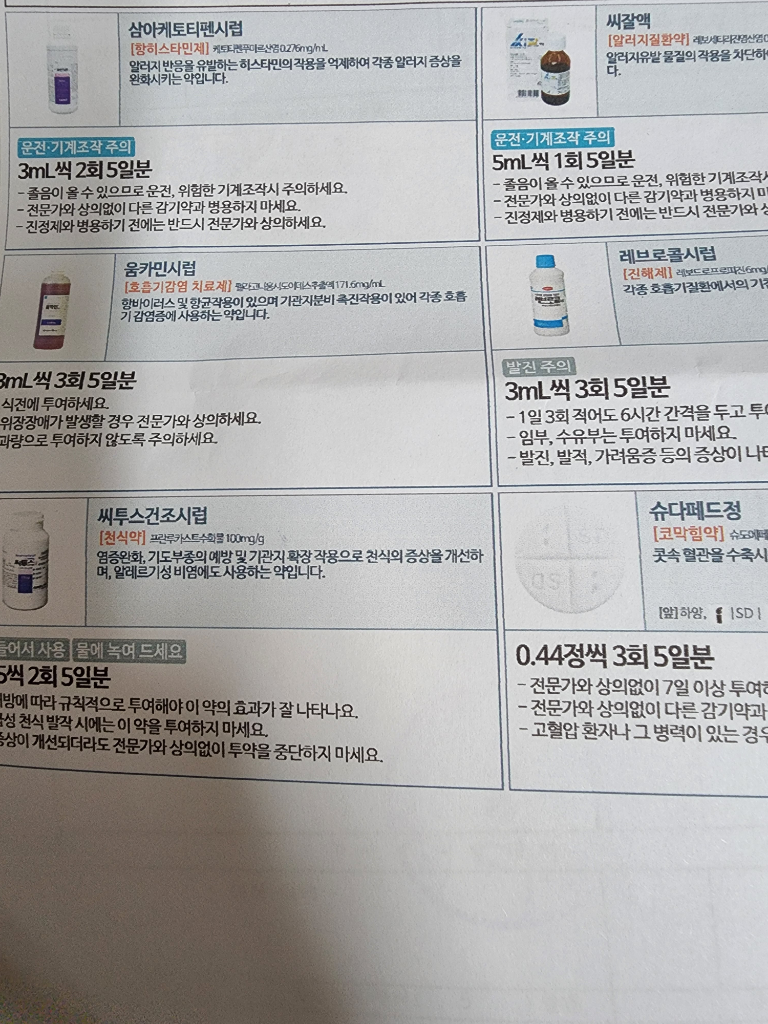 처방 받은 약에는 코감기약, 기침가래약 종류가 포함되어 있습니다. 해열제는 없으므로 열이 난다면 덱시부프로펜, 아세트아미노펜 계열의 해열제를 복용해도 괜찮습니다.