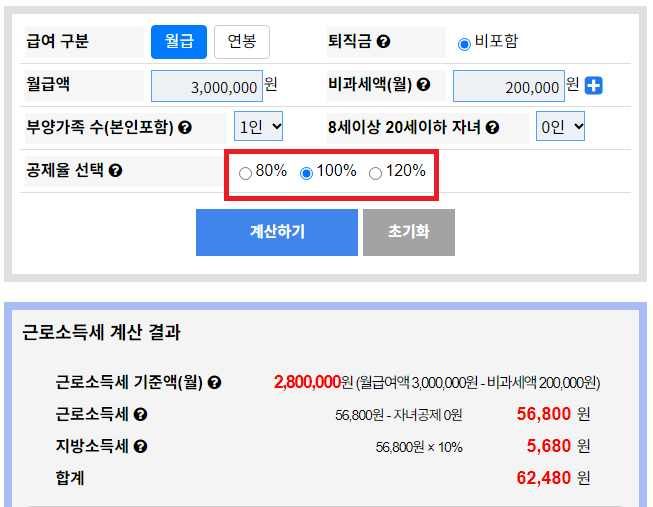 반대로 80%로 설정하는 경우 세후소득이 늘어나나 연말정산시 정산액을 반환해야 할 수도 있습니다.