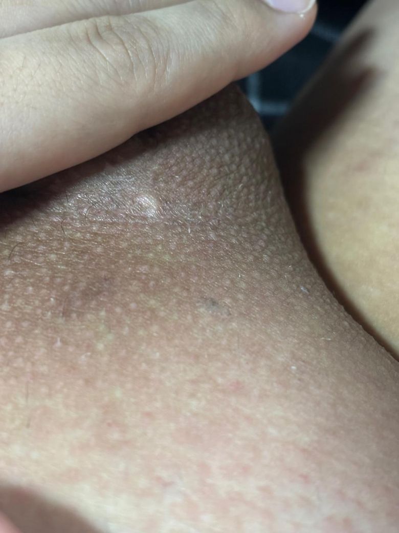 가렵지도 않고 아프지도 않습니다. 만지면 살짝 여드름처럼 잡혀요. 터뜨려보려고 힘줬는데 터지지도 않습니다.